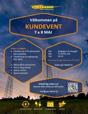 Välkomna på kundevent! Det kommer bli föreläsningar om solceller, UPS och energilagring, demonstration av UPS, energilagring och reservkraft. Det blir även tipspromenad och bjuds på....
